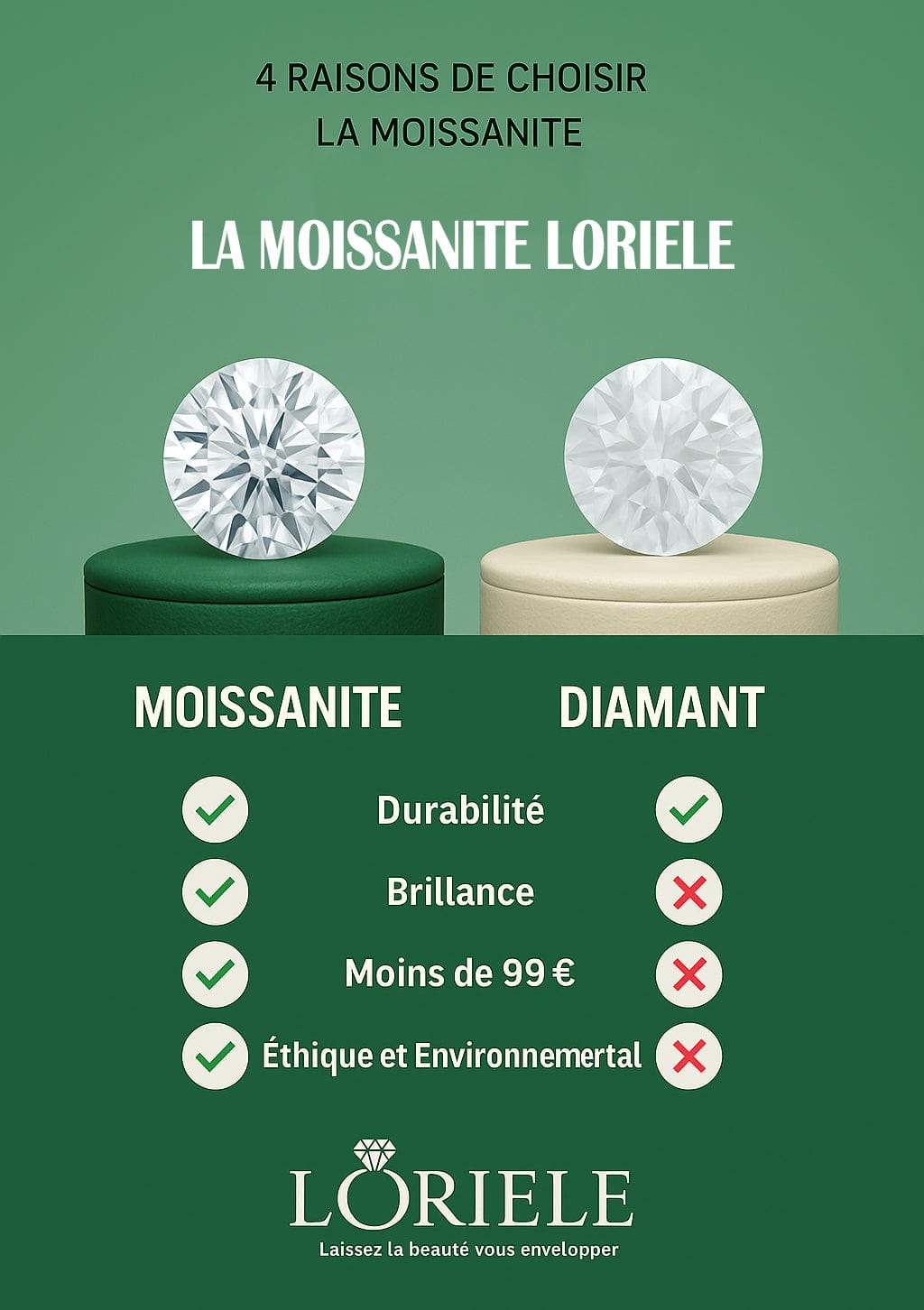 Chez LORIELE™, Nous avons sélectionné la moissanite la plus pure et la plus brillante comme pierre pour nos bijoux.